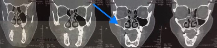 Tomografia computadorizada de seios da face revelando sinusopatia maxilar e etmoidal à direitaAbertura do seio maxilar direito com saída de secreção mucopurulenta